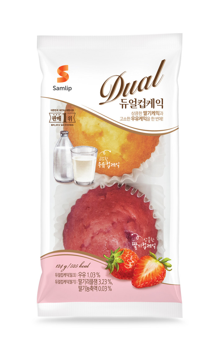 듀얼컵케익은 딸기 컵케익과 우유 컵케익이 함께 들어 있는 제품으로 두 가지 맛을 동시에 즐길 수 있는 것이 특징이다.