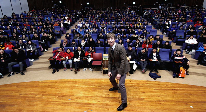 | ▲포럼 참가자들이 줄리안의 강연은 흥미진진한 재미와 함께 학생들과 대화식으로 진행해 많은 박수를 받았다. 사진은 강연 도중 기념촬영하고 있다. © 환경데일리 |