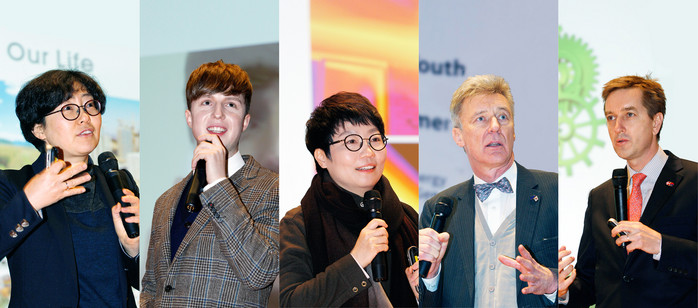 | ▲강연에 집중하는 세계청소년지구환경포럼 연사들. (사진 왼쪽부터) 윤순진 서울대환경대학원 부원장, 방송인 줄리안 퀴타르트, 이명주 명지대 교수, 제라드 사바틸 주한EU대사, 토마스 레만 주한덴마크 대사 © 환경데일리 |