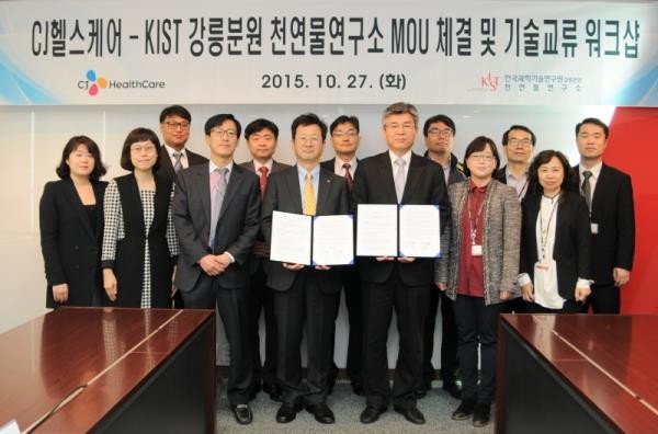▲CJ헬스케어(대표 강석희)는 한국과학기술연구원 강릉분원 (분원장 오상록, KIST) 천연물 연구소와 천연물 소재발굴 및 사업화를 위한 업무협약을 체결했다. © 환경데일리 |