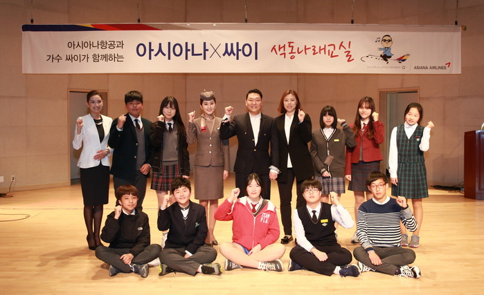 [환경데일리 김영민 기자] 아시아나항공(사장 김수천) 홍보대사 가수 싸이가 18일(월) 서울시 양천구 소재 목동청소년수련관에서 열린 색동나래교실에 직접 강사로 나섰다.