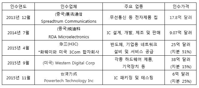 칭화즈광은 2013년~2014년 잔쉰통신(展訊通信), RDA(銳迪科) 등 IC 회로 설계 및 개발 능력을 지닌 중국기업 인수를 시작으로 미국과 대만 등 세계적 반도체기업도 잇달아 인수하며 반도체산업의 산업체인을 구축했다. 즈광그룹(紫光集團) 동사장 자오웨이궈(趙偉國)는 향후 5년 동안 3000억 위안(약 470억 달러)를 투자, 세계 3대 반도체 제조기업으로 성장한다는 목표를 밝혔다.